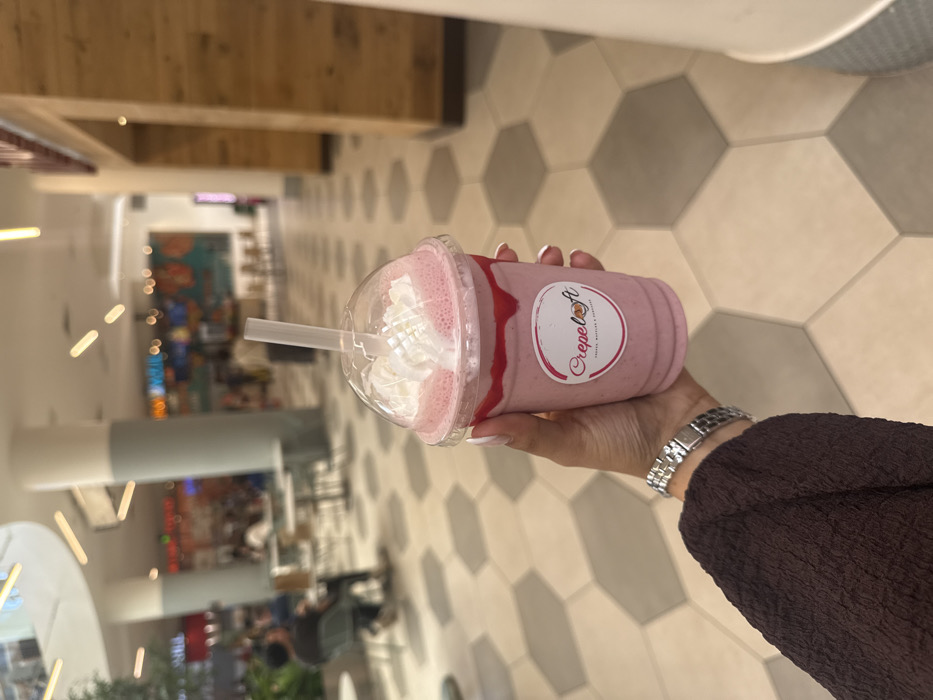 A right hand, displaying white-polished fingernails and a silver-toned metal watch on the wrist, holds a clear plastic cup containing a pink beverage. The drink, appearing to be a smoothie or milkshake from "CrepeLicious" (as indicated by the label), features a base of pink liquid, a layer of red syrup visible inside the cup, and is topped with white whipped cream, complete with a clear plastic domed lid and a straw. The hand emerges from a dark brown, textured long sleeve. The setting is an indoor commercial environment, specifically identified as the food court area of the Burbank Town Center in Burbank, California, United States. The floor is covered with a pattern of alternating light grey and off-white hexagonal tiles. In the blurred background, large structural pillars ascend to high ceilings. To the left, several indistinct figures are seated at tables. Further in the background, numerous brightly lit food stalls and storefronts are visible, lining the spacious interior. Wooden slat paneling is present on the right side of the frame.