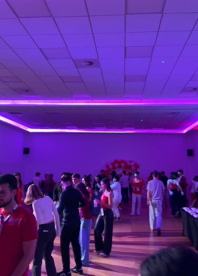 busy event hall, lit with violet and pink ambient lighting. People are mingling and dancing, dressed mostly in red and white, some with lanyards around their necks. Several tables with refreshments line one side of the room. Decorative balloons cluster in the background. The overall atmosphere is lively and celebratory.