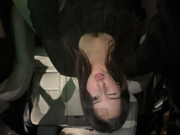 The image depicts a young adult female occupying the front passenger seat of a vehicle. She has long, dark hair and is dressed in a black, long-sleeved top with a ruched front detail. A gold-toned earring is visible on her right ear. Her facial expression is a wink with her right eye (viewer's left) and pouted lips with the tongue slightly extended, directed towards the camera. The vehicle's interior is dimly lit, suggesting nighttime, with light-colored, possibly leather, upholstery visible on the rear seats. A dark-clad individual is partially visible on the far right side of the frame. No specific urban landmarks or environmental identifiers are discernible to determine a precise location within Herzliya, Israel.
