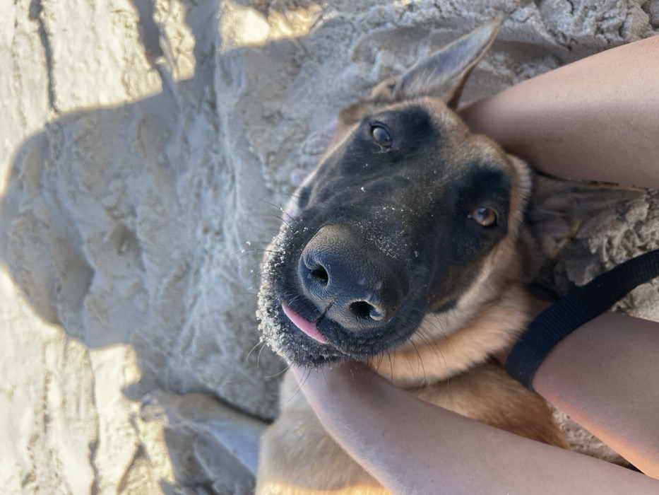 - "The image presents a low-angle, close-up perspective of a light-brown and black-muzzled dog, likely a Belgian Malinois, lying on its back or side on a sandy beach" by FM-czuIx1, licensed under CC BY 4.0