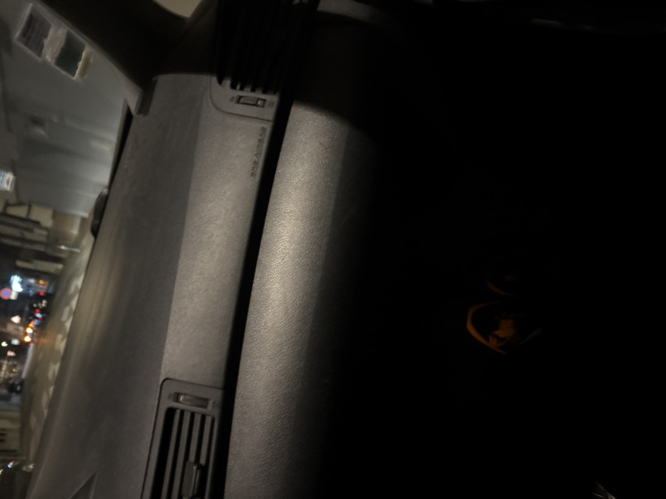 The image displays a nighttime scene from inside a vehicle, looking forward through the windshield onto a street in Erstein, France. The immediate foreground shows the dark gray dashboard of the vehicle, partially illuminated. A rectangular air vent with horizontal slats is visible on the left side of the dashboard. Centrally on the passenger side, the text "SRS AIRBAG" is present. To the right, a vehicle A-pillar partially obstructs view of another dashboard component. The lower portion of the image, beneath the dashboard, is dark, with an indistinct orange glow or reflection visible in the bottom-left. Beyond the windshield, a street lined with buildings is illuminated by various artificial light sources, including streetlights and vehicle headlights/taillights, casting reflections on the road surface. A red circular traffic sign with a white horizontal bar is discernible on the left side of the street. No individuals are clearly identifiable within the frame.