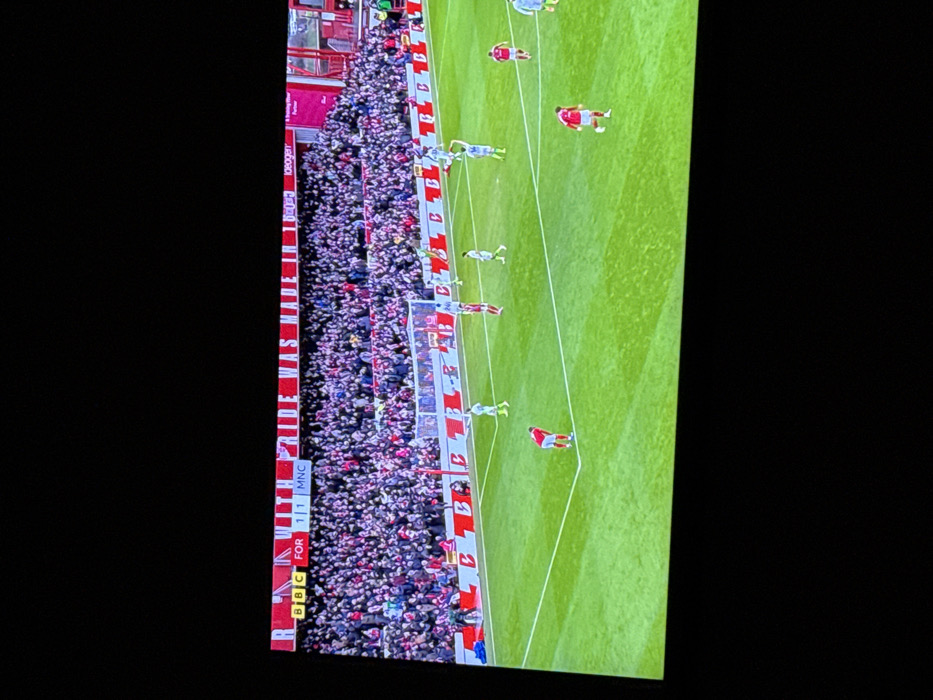 A football match is underway. The game appears to be between "FOR" and "MNC," with the score tied at 1-1, as indicated by the BBC scoreboard on the screen. A dense crowd of spectators fills the stadium stands. Players in red and white kits are visible on the green pitch, engaged in active play. The scene is captured from a television screen displaying the live match.