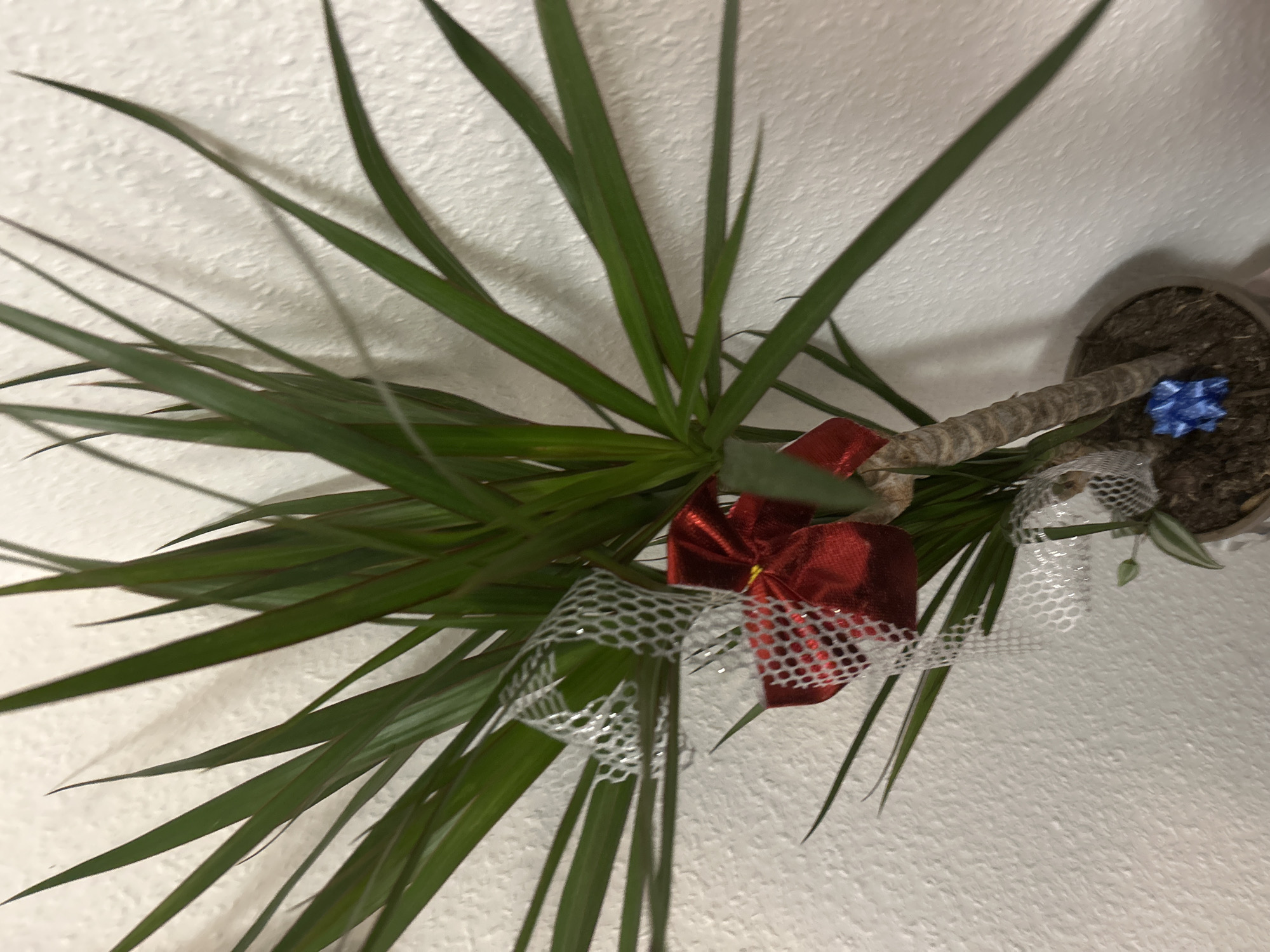 A potted houseplant is photographed from above against a light, textured wall. The plant has long, slender, green leaves radiating from a central stem. The plant is adorned with a red bow and white lace ribbon. A small blue bow is visible near the base of the stem where it meets the soil. The pot appears to be gray or brown. There is no indication of the location being Karlsruhe, Germany, in the image.