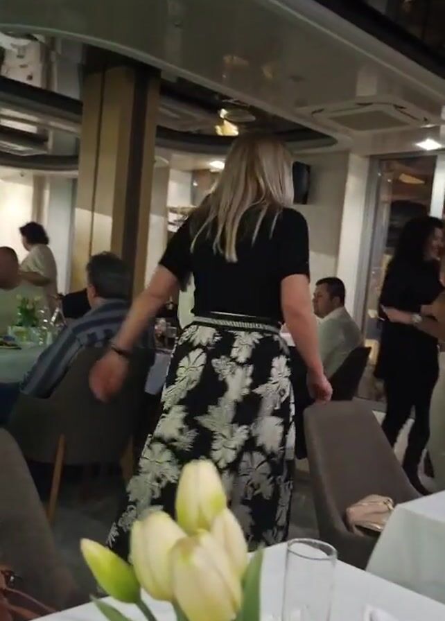 interior of a restaurant where several women are dancing. The camera is positioned near a table set with a white tablecloth, glassware, and a vase of yellow tulips. The women are dancing in the open space near the tables; one is wearing a black top and a black-and-white floral skirt. Other people are seated at nearby tables. The restaurant has a modern design, with light-colored walls, dark chairs, and reflective surfaces. A man in a light-colored shirt sits at a table in the background.