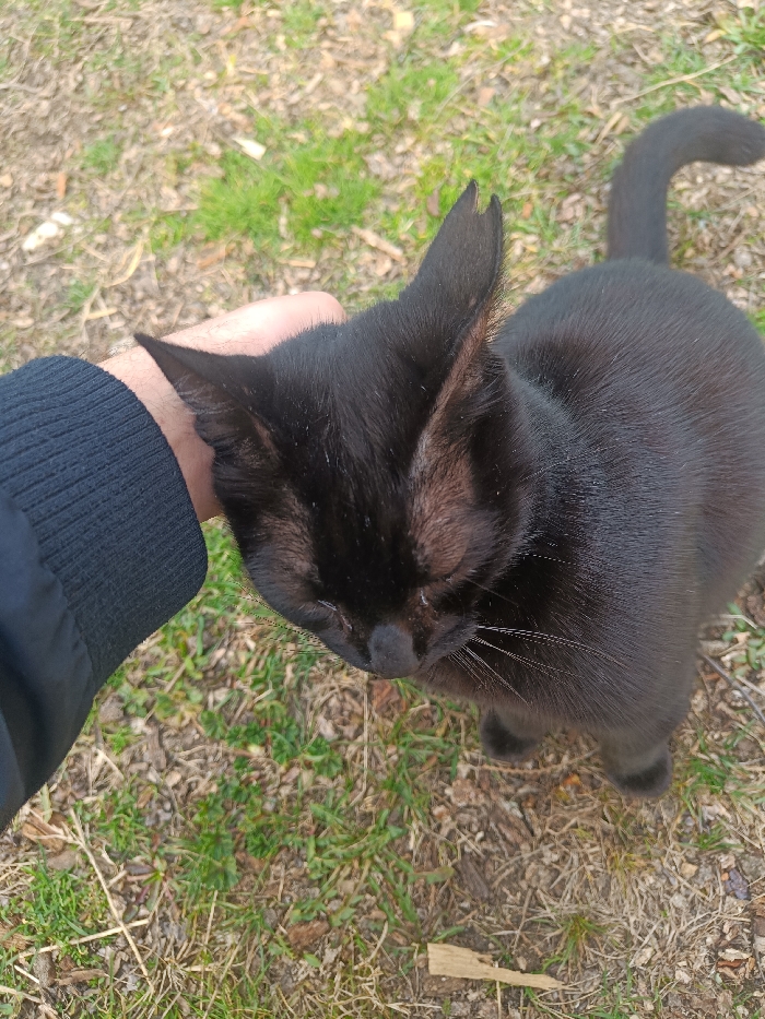 - "In Byala, Bulgaria, an outdoor scene depicts a human's right hand petting a black cat" by FM-JLyeu2, licensed under CC BY 4.0