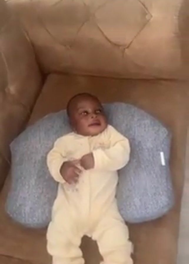 baby lying on a brown couch, supported by a gray pillow. The baby is wearing a light yellow onesie with a faint design. The baby looks at the camera with a serious expression, clenching their fists.