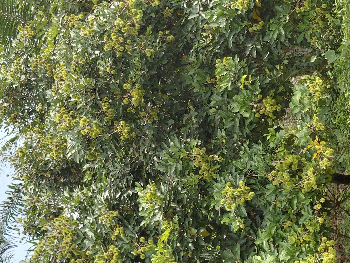 A lush rambutan tree, densely packed with vibrant green foliage, dominates the frame