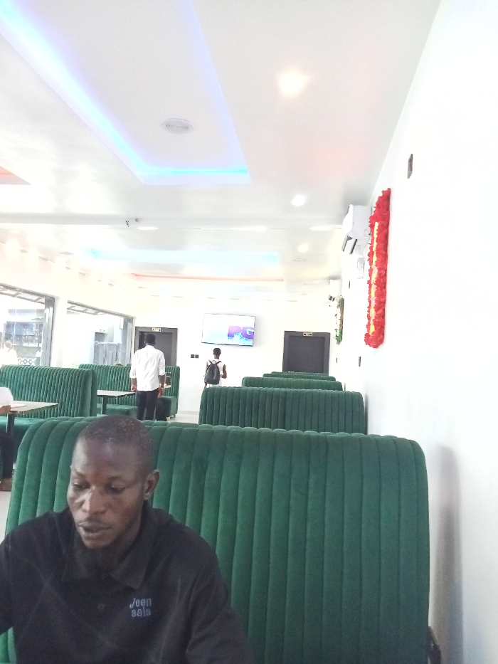 interior of a restaurant in Ujevwu, Nigeria. The scene is a dining area, featuring a row of green velvet booths, each with a built-in table. A single man sits facing the camera on the right side of the image, his back to the booth. He is dressed in a black shirt with the inscription "Jean Sale" visible on his right shoulder. Two other men can be seen in the distance, walking towards the back of the restaurant. One wears a white shirt, the other a dark shirt and a black backpack. The restaurant has a white ceiling with recessed lighting, including a long, thin blue light fixture running the length of the ceiling. The walls are white, with an air conditioner visible on the wall to the right of the image. A flat-screen television is mounted to the wall in the back, directly in front of the seated man. The restaurant has a modern aesthetic, with clean lines and a minimalist design.