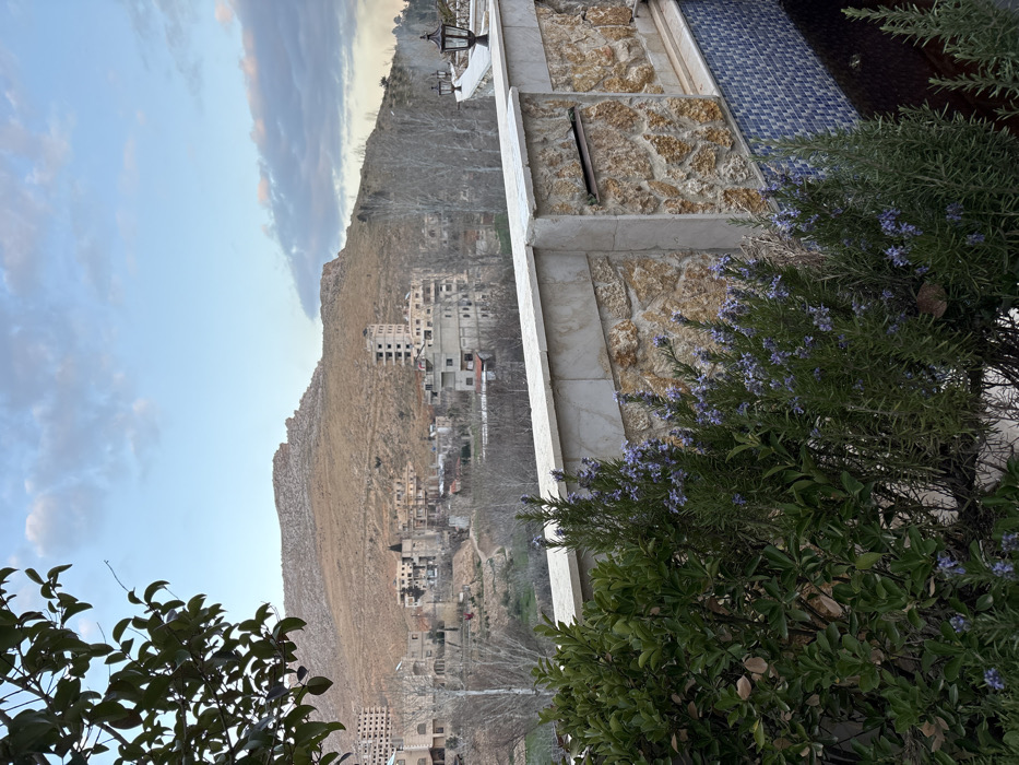 The image presents an elevated panoramic view overlooking a valley and a settlement in Munin, Syria. The foreground features a dark green leafy branch partially obscuring the upper left corner. Below, a dense arrangement of green shrubs, some displaying small purple flowers (consistent with rosemary), occupies the immediate lower section, positioned in front of a substantial stone and concrete wall. This wall, topped with light-colored coping, exhibits a textured surface of irregularly shaped beige and brown stones, with a segment of blue mosaic tiles visible towards its base on the right. Two dark, lantern-style light fixtures are mounted on the coping of this wall on the right side. The midground reveals a valley containing numerous bare deciduous trees and scattered green vegetation. A collection of multi-story buildings, comprising a town or village, is visible across the valley floor and ascending slopes. Several of these structures appear residential, with some showing indications of incomplete construction or disuse, evidenced by exposed concrete frames and unfinished facades. A winding dirt path or road is discernible through the valley. The background is dominated by a large, barren, rocky mountain or hill, characterized by a light brown, arid surface. The sky above is light blue with scattered white and light gray clouds, suggesting either early morning or late afternoon lighting conditions. No human figures are present in the scene.