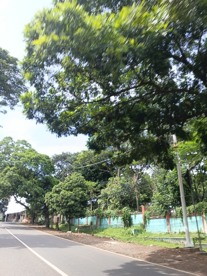 A road stretches through a lush, green landscape. Trees line both sides, creating a canopy overhead. A light blue wall with red accents runs parallel to the road, separating it from overgrown vegetation. A solitary utility pole stands beside the road, adding a vertical element. The image suggests a scenic drive through a natural environment.