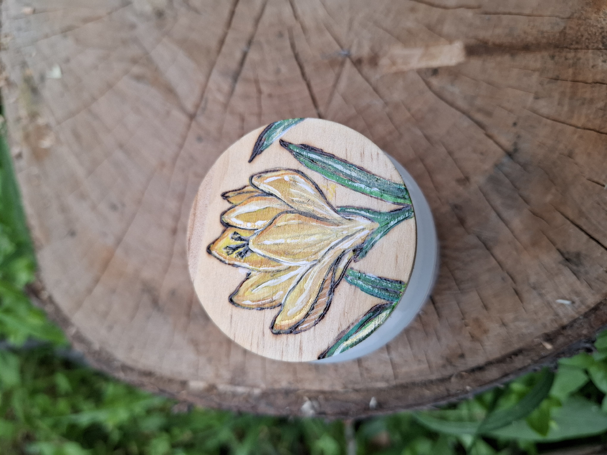 A round wooden lid, approximately 8 cm in diameter, is centrally positioned on the flat, cut surface of a tree stump. The lid is adorned with a hand-painted image of a yellow, crocus-like flower, outlined in black, featuring multiple petals in varying shades of yellow, white, and gold, alongside two green leaves exhibiting a slight shimmer. A segment of a plain white or light grey cylindrical container, to which the lid belongs, is visible beneath the wooden piece. The tree stump displays concentric growth rings and vertical fissures, with areas of darkened wood grain. The immediate background, out of focus, consists of blurred green foliage, indicative of grass or low plants. The scene is illuminated by natural, diffused light. No individuals, animals, or active interactions are present. The location of this scene is Graf Ignatievo, Bulgaria.