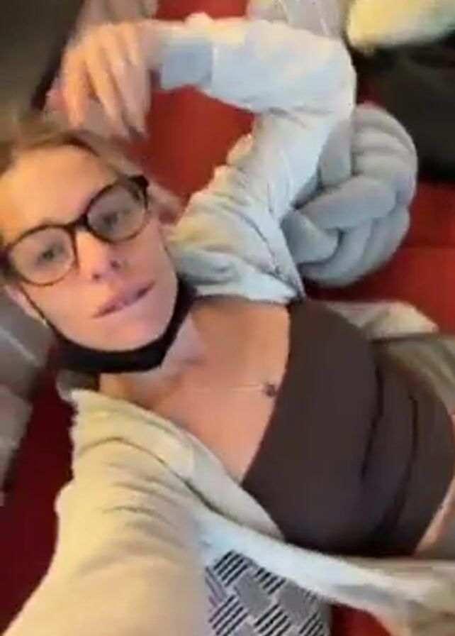 woman lying on a red couch in a modern, brightly lit lobby. She is wearing glasses, a brown strapless top, a grey hoodie, and jeans. She has her hands on her head and is looking at the camera. A black mask is around her neck. The camera pans to the side, showing her legs stretched out on the couch, and then to the surrounding lobby area. There are other people walking by, as well as modern furniture and decor including a black table, a yellow chair, and a decorative shelf.