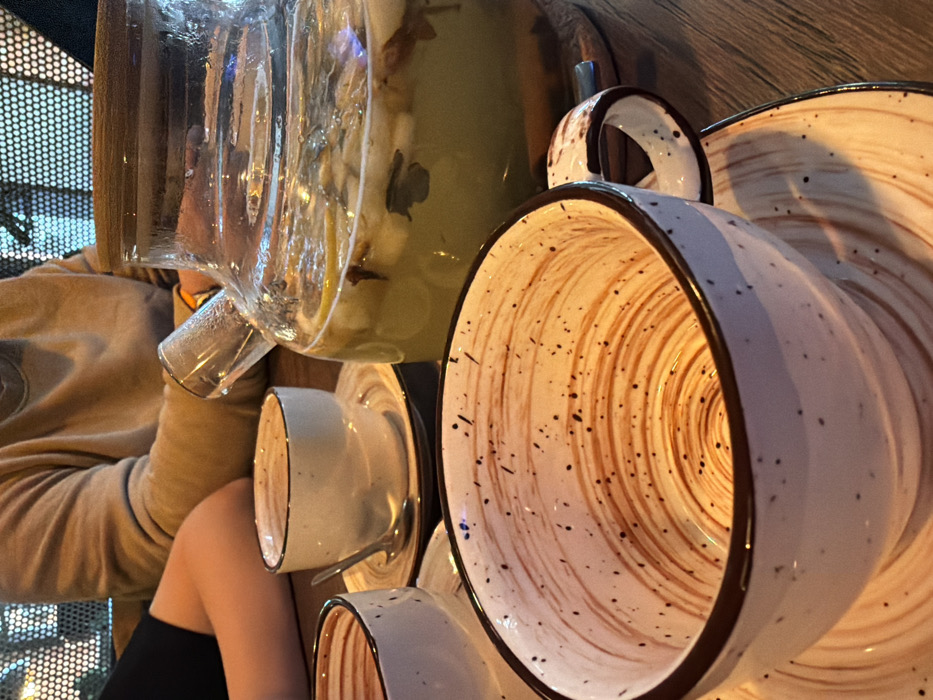 The image depicts an indoor scene within what appears to be a cafe or restaurant. Two individuals are partially visible at a wooden table. On the right, a person is seen from the chest down, wearing a light brown long-sleeved top, with their forearm resting on the table. On the left, another person's lower arm and hand are visible, wearing a dark long-sleeved garment. The table holds several ceramic items with a distinctive speckled and spiral pattern. In the immediate foreground, a large, empty ceramic cup with a brown rim and internal brown spiral pattern, speckled with dark dots, rests on a matching saucer. To its left, a similar, partially visible cup and saucer are present. In the mid-ground, a third, smaller ceramic cup with the same speckled design contains residual light-colored liquid or foam and a silver spoon. Adjacent to this cup on the right is a large, clear glass teapot with a wooden lid. The teapot is filled with a pale yellow liquid containing slices of lemon, mint leaves, and other visible spices, such as cloves. The teapot sits on a circular wooden coaster. The background features a perforated metal screen or panel, through which diffuse light is visible. The specific location within the city of Saint Petersburg, Russia, is not identifiable from the visual information provided in the image.