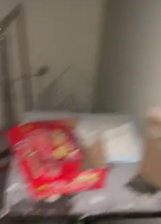 confined, dusty room with a retractable wooden ladder leading upwards. The room's floor is covered in patterned tiling, with loose debris scattered around. A green garden hose is visible along the upper left wall. A red and white box sits in the background, along with other indistinguishable objects. The camera angle pans from the ground to focus on the ladder.