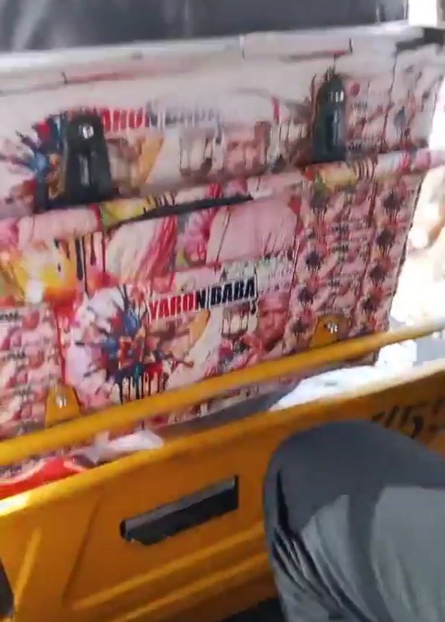 view from inside a yellow three-wheeled vehicle, possibly a tuk-tuk. The back of the passenger area is decorated with images of a man and the words "YARON BABA" There are people walking and riding motorcycles outside the vehicle. A sign in the background indicates "Reduced Speed 60 km/h." The vehicle seems to be either stopped or moving slowly amidst traffic. One man on a red motorcycle looks like he is talking on the phone.