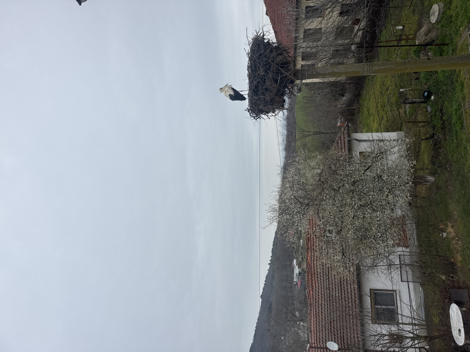 The image depicts a rural scene in Atiya, Bulgaria, under an overcast, light gray sky. A single white stork, exhibiting black primary and secondary flight feathers, stands upright within a substantial stick nest perched atop a concrete utility pole in the right midground. Horizontal electrical wires traverse the upper midground. To the left of the utility pole, a white residential building with a terracotta tiled roof features a visible satellite dish. This house is partially obscured by a large deciduous tree covered in white blossoms, indicating a spring season. Another two-story building with a terracotta tiled roof is visible behind the utility pole to the right. The lower foreground shows green ground cover, with a portion of a round outdoor table visible on the far left. In the background, rolling hills densely covered with forest and bare trees are visible on the left, transitioning to open green fields on the right, extending towards a hazy horizon under the consistent cloud cover. No human subjects are visible.