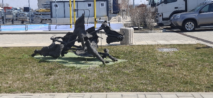 The image depicts an outdoor urban scene in Novi han, Bulgaria, under bright daylight. In the immediate foreground, a strip of grey concrete sidewalk is visible. Adjacent to it, a patch of green grass features a recessed square metal access cover. Centrally positioned on the grass is a dark-colored, abstract metal sculpture, appearing to represent gnarled roots or organic forms, resting on a small, circular patch of artificial green turf. To the left of the sculpture, a paved area separates the grass from a blue-surfaced sports court with white boundary lines and low metal railings. Beyond the court, a construction or storage area is visible, containing stacks of metal scaffolding or framework, and at least two temporary-style buildings (one white, one light blue). Yellow metal structures are also present in this background area. To the right of the sculpture, a cylindrical light-colored concrete bollard stands on a grey paved surface. Behind the bollard and extending further right, a parking area contains a white semi-truck tractor unit and a silver/grey SUV, both parked. Bare, leafless bushes are situated behind the bollard. The sky above is clear and bright. No individuals are visible in the scene.