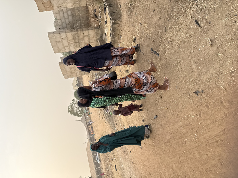 Four individuals and a toddler stand on sandy terrain near some structures. The persons are dressed in colorful traditional attire. The woman on the top is wearing a black cape with a patterned dress. The woman beneath has a brown patterned dress. The woman third from the top has a green dress. All women have their head covered with a Hijab. The last person has green clothes. The toddler is in front of the third woman.