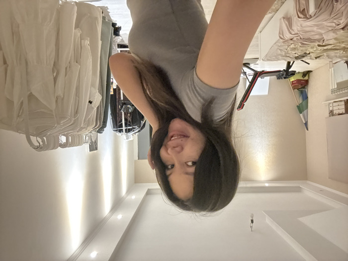 An indoor scene in a room located in село имени 9 Января, Russia, depicts a female individual positioned in the center-right foreground, captured from the chest up. She faces the camera, smiling with teeth visible, and has long, dark hair. She wears a light gray t-shirt, and her left hand is raised, touching her hair near her temple. To the left of the individual, a white bed frame with rumpled light-colored bedding is present. Further into the background on the left, a white radiator is installed below a wall-mounted shelf holding stacked brown boxes. A blue, green, and white striped flag leans against the wall in the corner, adjacent to a red and black folding exercise bench and a white panel leaning against the wall. To the right of the individual, two garment racks are visible. The rack closer to the viewer displays numerous white articles of clothing, including dresses and tops, on clear plastic hangers. The second rack, positioned behind it, holds darker garments, and a small dark handbag is suspended from it. The room features light-colored walls, with the left wall exhibiting a subtle patterned texture. The ceiling is a dropped design with multiple recessed spotlights, and a single bare light bulb hangs from a fixture on the left side. The floor throughout the visible area is light-toned.