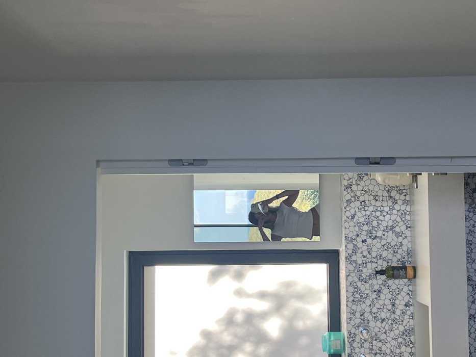 This image captures an indoor bathroom or vanity scene, located in the city of Modio, Greece. A light-skinned individual, appearing female, with long, dark hair, is seen reflected in a rectangular wall-mounted mirror, centered above a countertop. She is wearing a white sleeveless crop top and light-colored bottoms, holding a light-colored smartphone with both hands to take a mirror selfie. The mirror's reflection also displays an outdoor coastal landscape: a clear blue sky with scattered clouds, a body of blue water, and green and yellowish hills covered in vegetation. A white roller blind is visible in the reflection above the outdoor vista. The interior foreground features a light-colored countertop with an integrated rectangular sink basin. A chrome-colored faucet with two knobs is mounted above the sink, set against a mosaic-tiled backsplash patterned with white and blue/grey irregular shapes. A dark green pump bottle rests on the counter to the right of the sink. To the left, a teal-colored glass jar or candle is positioned near a large window with a dark frame, which is illuminated by bright natural light, casting distinct shadows of foliage onto its surface. A portion of a white door or doorframe with a visible silver hinge is present on the right side of the image.