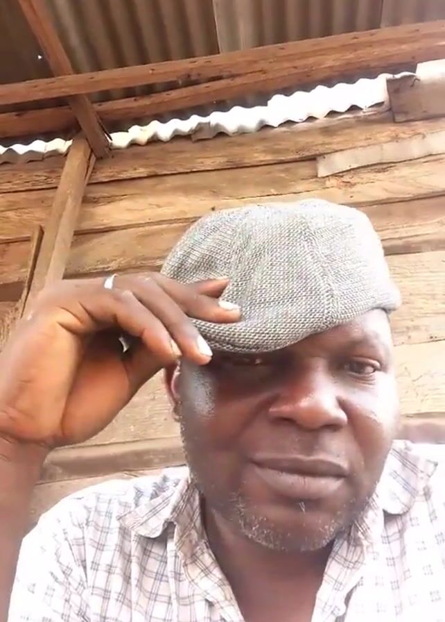 close-up of a middle-aged Black man. He is wearing a gray newsboy cap and a plaid shirt. The man adjusts his cap and smiles. He has a wedding ring on his left hand. He is positioned under a wooden structure with a corrugated metal roof. The background appears to be a simple wooden wall. The lighting is natural, and the scene suggests an outdoor or semi-outdoor setting.