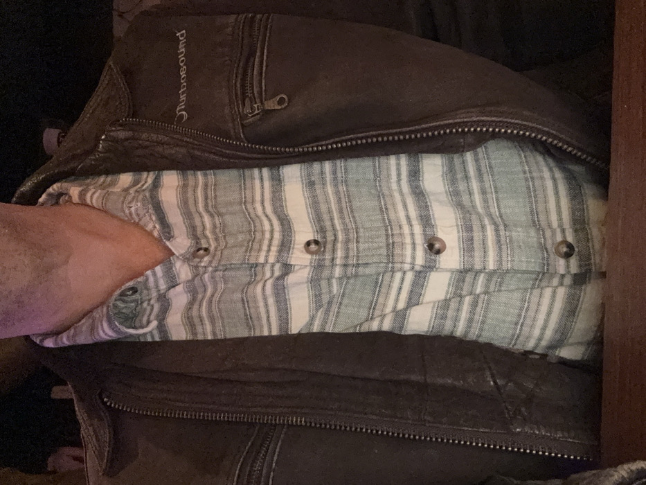 - "A person wears a striped blue and white button-down shirt, partially obscured by a brown leather jacket" by FM-La8Z13, licensed under CC BY 4.0