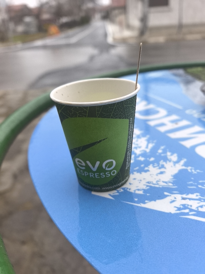 - "A green and white disposable paper cup, branded "evo espresso" with leaf-like patterns and visible website text "www" by FM-bICck1, licensed under CC BY 4.0