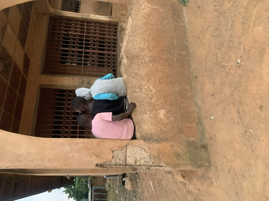 Three young individuals are seated side-by-side on a wide, weathered concrete ledge of a single-story, reddish-brown building in a residential or commercial area of Jos, Nigeria