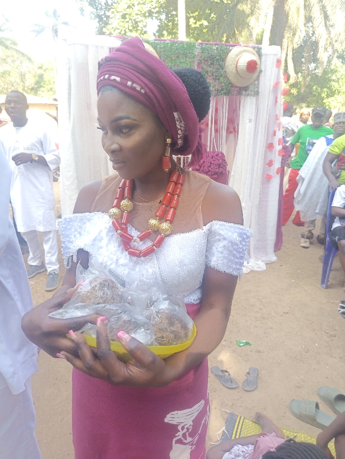 A woman wearing a maroon head wrap, white off-the-shoulder beaded top, and a maroon skirt with white patterns holds a yellow plate containing food items wrapped in clear plastic. She wears a red beaded necklace and matching earrings. In the background, there are people, a decorated backdrop with white curtains, and what appears to be an outdoor wedding setting. Sandals are scattered on the ground nearby.