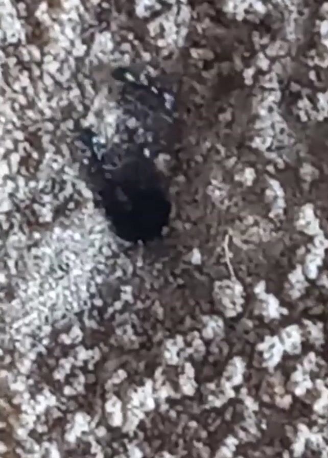 The close-up video shows a dark, roughly circular hole in a grainy, textured surface composed of brownish-gray material interspersed with small, lighter-colored fragments