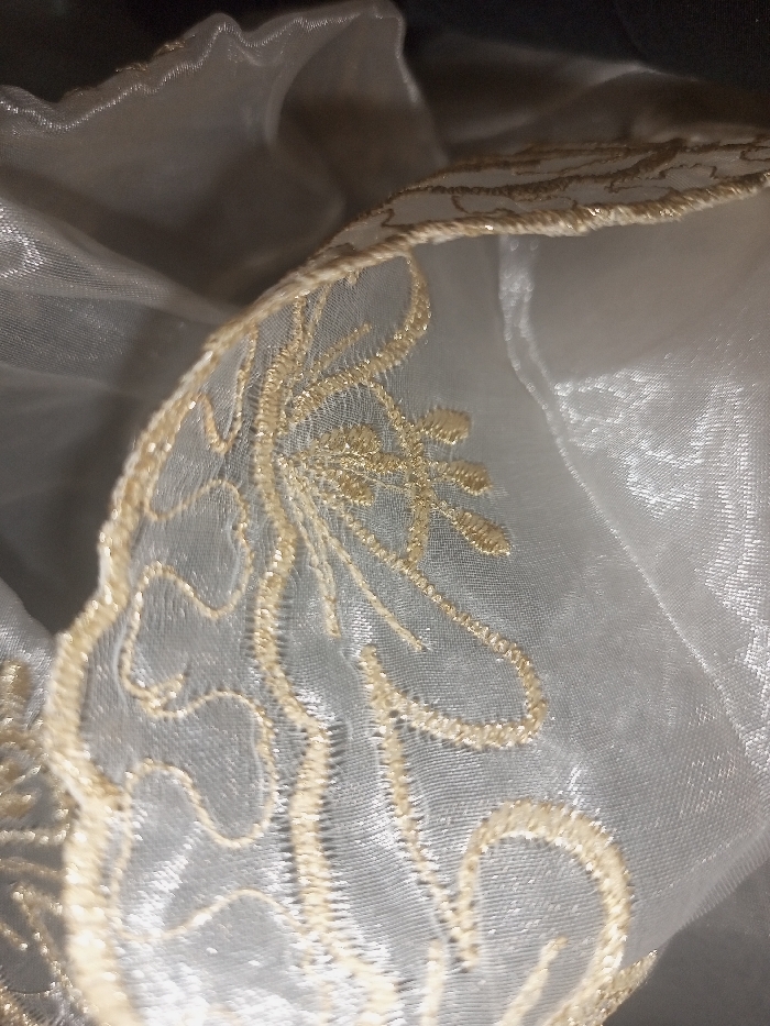 - "The image displays a close-up of a ruffled, translucent light-colored fabric, likely white or pale silver, adorned with metallic gold embroidery" by FM-MOar22, licensed under CC BY 4.0