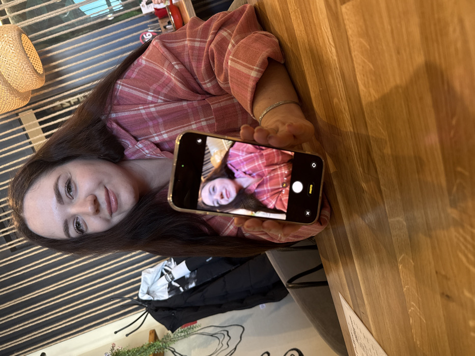 An adult female is seated at a light-colored wooden table, in what is identified as the "Family Restaurant CHEVANO" (Семейный ресторан ЧЕВАНО) located at Профессиональная ул., 1А, Dmitrov, Moscow Oblast, Russia. The woman, appearing in her 20s to early 30s with long, dark brown hair, is wearing a pink and white plaid shirt. She holds a gold-colored smartphone horizontally with both hands, presenting its active camera screen directly towards the viewer. The phone's screen displays a live selfie preview of the same woman, wearing the identical plaid shirt and smiling slightly. The woman herself is looking directly at the camera with a gentle smile. A silver-colored bracelet is visible on her right wrist. The immediate surroundings include a grey upholstered chair back and a black multi-pronged coat rack holding a black puffer jacket and a white garment, positioned behind her to the left. The background wall features vertical striped decorative paneling, possibly ropes or wood. A woven, basket-like light fixture hangs from the ceiling in the upper right. A white folded paper, likely a menu, is visible on the table to the left. Further in the background, a small red container and a red sign with the number "16" are discernible on a distant table. The scene is illuminated by warm, artificial lighting.