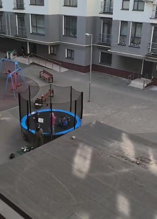 n elevated view of a courtyard situated in a residential complex. The courtyard features a variety of playground equipment, including a swing set, a merry-go-round, benches, and a trampoline. Three individuals are present within the enclosed trampoline: two children and one adult. The adult is assisting the children. The video is recorded from an elevated perspective, presumably from a window overlooking the courtyard.