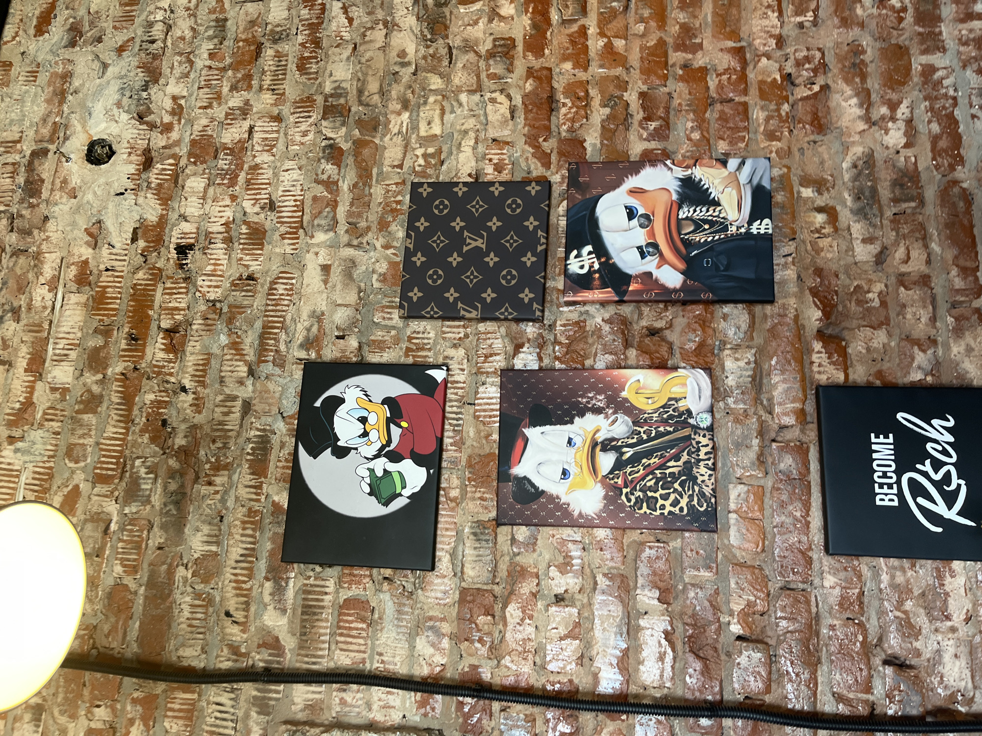 section of a brick wall featuring an assortment of art pieces. The brick wall has a textured appearance with areas of exposed mortar. Five framed artworks are mounted on the wall: a square canvas displaying a pattern reminiscent of Louis Vuitton, two canvases depicting Scrooge McDuck in hip-hop-inspired attire with dollar signs, one canvas showing Scrooge McDuck holding money in front of a moon, and a black canvas with the words "BECOME RICH" in white lettering. A lamp is visible on the lower left, and a black cable runs horizontally across the lower portion of the wall. The city and country cannot be determined from the image alone.