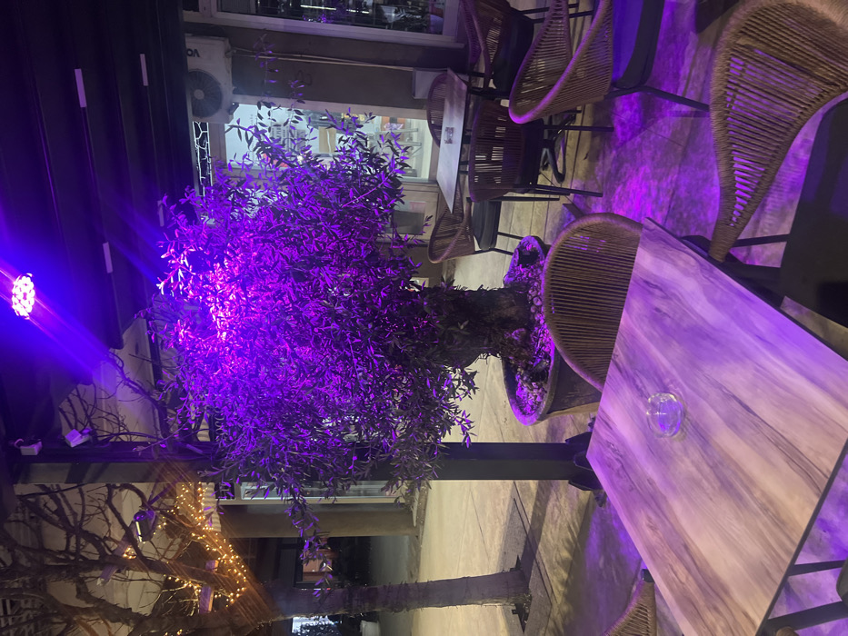 The image displays an unoccupied outdoor patio of a commercial establishment at night, situated in Smederevska Palanka Municipality, Serbia. A large potted tree with dense green foliage is centrally located, illuminated by a direct, intense purple light emanating from an overhead fixture, which casts a strong magenta hue across the tree, the paved ground, and the immediate furniture. The tree's pot is dark-colored. In the foreground, a rectangular table with a light-colored, patterned surface is present, featuring a clear glass ashtray at its center. This table is flanked by chairs with woven wicker-style backs, dark frames, and dark seat cushions. Similar unoccupied tables and chairs are arranged further into the scene. To the left, two bare-branched trees are visible; one is adorned with warm white string lights. The background reveals a building facade with large glass openings and a white external air conditioning unit mounted above them. A dark overhead canopy structure with recessed lighting extends over the patio area. No individuals are present.