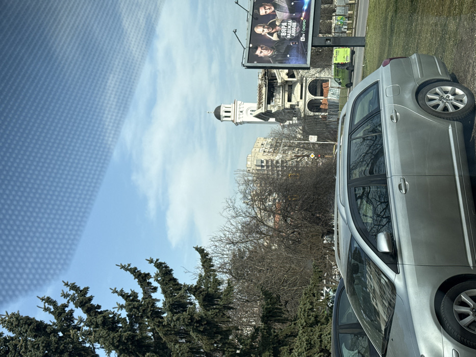 The scene captures a street in Sofia, Bulgaria, on a clear, partly cloudy day. The perspective is from within a vehicle, indicated by a patterned reflection across the upper sky. In the foreground, the side profile of a silver station wagon, equipped with roof rails, is visible on the left, partially obscuring a darker vehicle. The midground features a cluster of bare deciduous trees and a prominent coniferous tree on the left. Centrally, the white, multi-tiered tower of the Russian Church (Church of St Nicholas the Miracle-Maker) rises, crowned with a black dome and a cross. Immediately adjacent to the church tower, to the right, is a multi-story building at Tsar Osvoboditel Blvd. 15, exhibiting extensive structural damage or renovation, characterized by multiple arched window openings and exposed interior sections. Further right, a large illuminated billboard displays a promotional advertisement for a bTV program, featuring three male subjects and the Bulgarian text "ВЯРА НАДЕЖДА ЛЮБОВ" (Faith Hope Love) and "bTV СКОРО" (bTV SOON). A green commercial van is observed moving on the road behind the billboard. Distant, light-colored urban buildings are visible against the horizon in the background.
