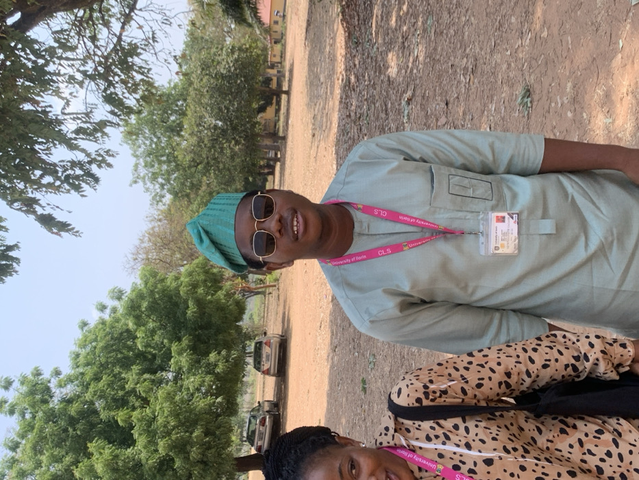 An outdoor daytime scene in Apata Yakuba, Nigeria, features two individuals. A young male, centrally positioned, faces the camera and smiles. He wears a light green, long-sleeved tunic with a small collar, a teal patterned cap, and gold-rimmed sunglasses. A pink lanyard, bearing "University of Ilorin CLS" text, hangs around his neck, displaying a clear identification card. Partially visible on the left is a young female, also smiling and looking towards the camera. She wears a brown and black spotted top and a pink lanyard with "University of Ilorin" text. The ground is dry, reddish-brown earth with sparse dry leaves. The background consists of numerous green trees, with two light-colored sedans parked beneath them on the left side. Low-rise buildings with light walls and dark roofs are visible through the trees in the right background. The sky is clear and light blue.