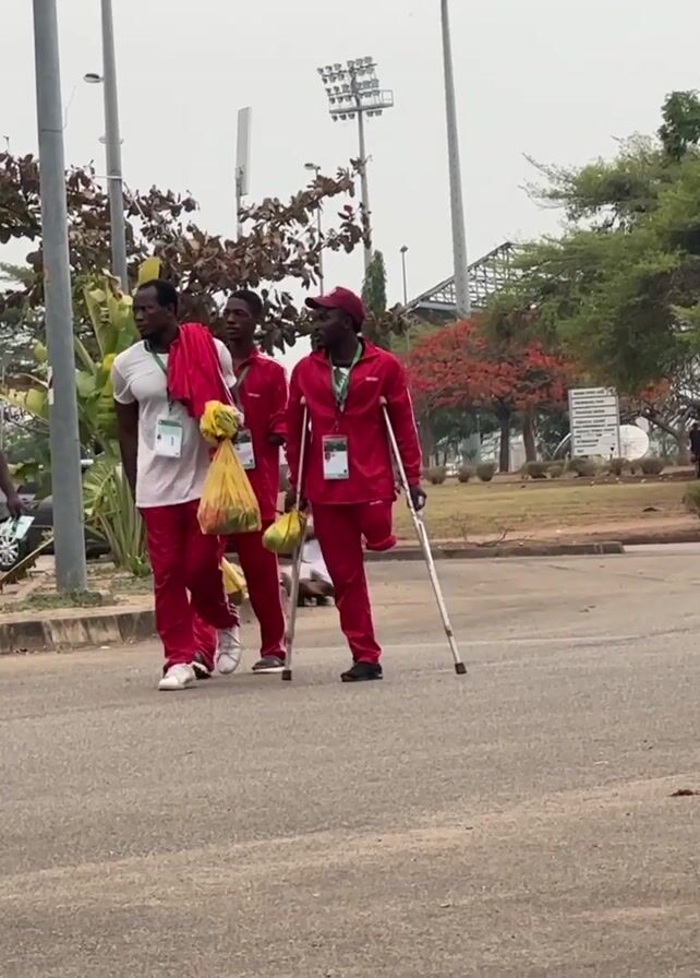 The scene features a street with several people, cars, and lush trees in the background. Four men are walking across the street, three of them closer to the camera. The first man is wearing a white T-shirt and red pants. The second man is also wearing red pants and carrying a white shirt and a yellow bag. The third man is using crutches and wearing a red suit with a badge around his neck. He is also carrying a yellow bag. The fourth man is kneeling on the side of the road. There is also a white van and several other cars parked in the background. The trees are lush and green, with some showing hints of red flowers. The sky is overcast, and the overall atmosphere seems relaxed.