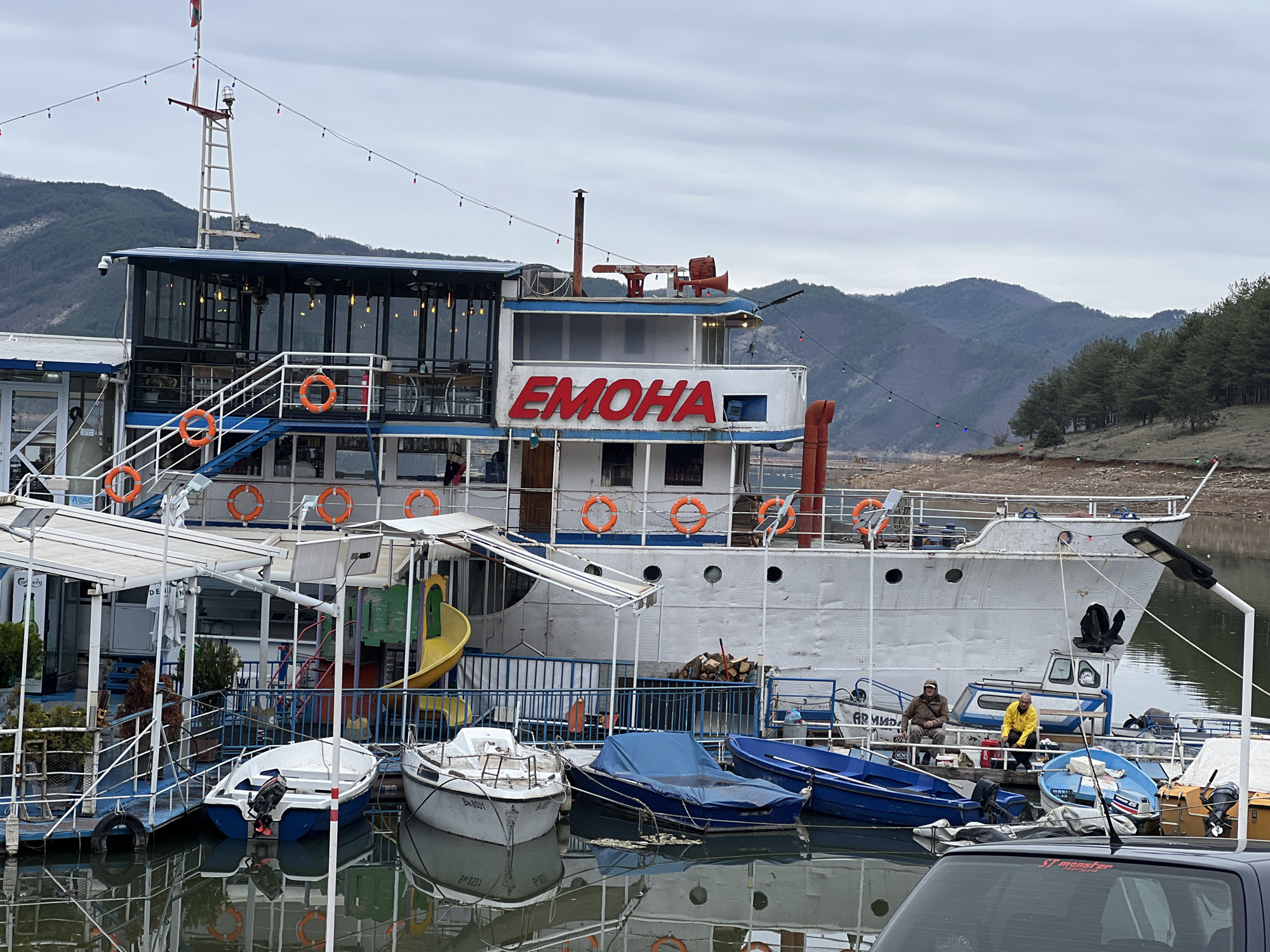 The image captures a scene at Brosh, Bulgaria, featuring a large vessel named "EMOHA" docked near a waterfront area. The vessel has a multi-level structure with visible windows and life preservers. A ladder reaches to the top, and a mast with lighting fixtures is present. Several smaller boats are moored alongside the larger vessel, some covered with tarps. On one of the boats, two men are seated; one is wearing a brown jacket, and the other a yellow jacket. The waterfront is near a tree-covered hillside. Overhead, strung lights are visible. The lower part of a dark car can be seen in the foreground. The sky is overcast.