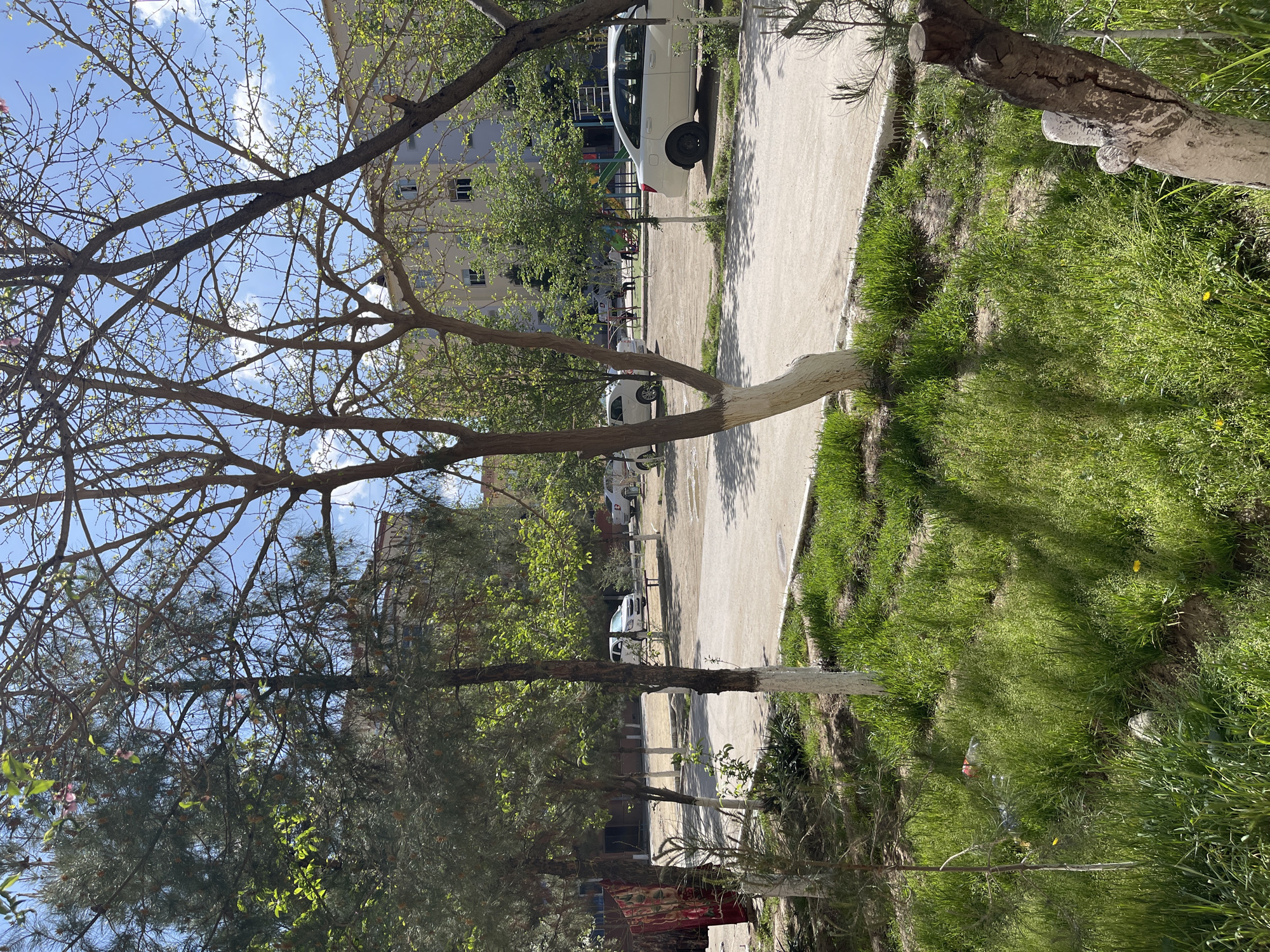n outdoor scene in Navoiy City, Uzbekistan. A paved pathway runs diagonally across the frame, bordered by grassy areas. Several trees are present, some with whitewashed lower trunks. In the background, there are parked cars and a building. The sky is visible through the tree branches, with some clouds present. The scene appears to be a residential or park area within the city. There are no discernible people.