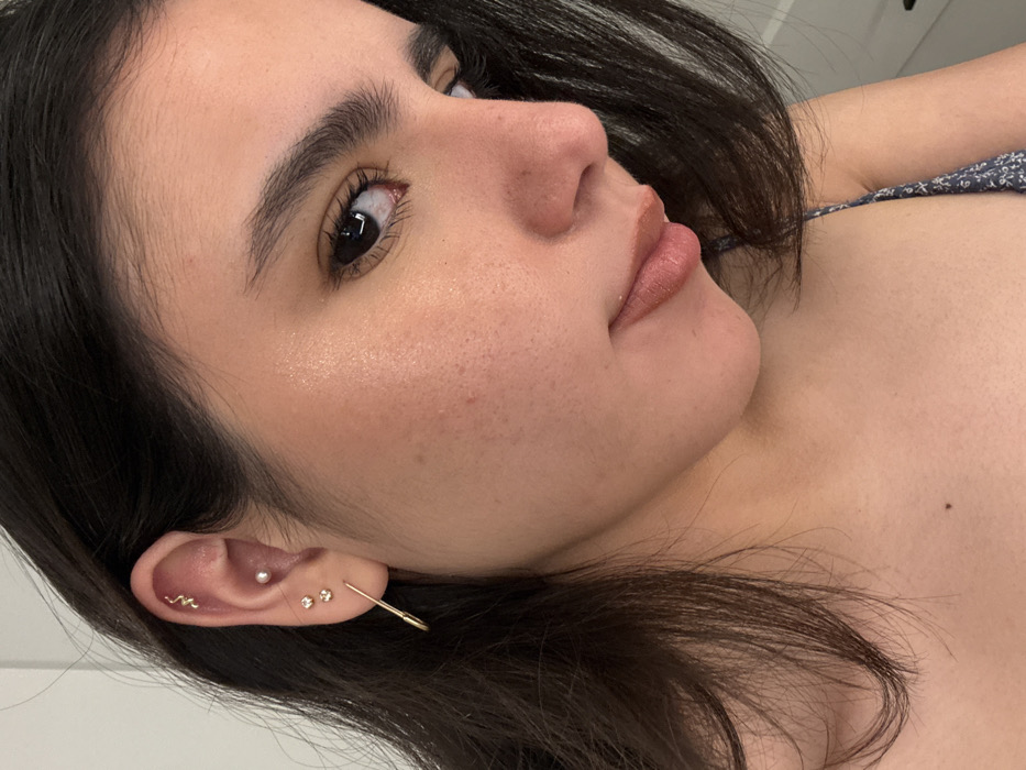 This close-up, high-angle profile image depicts the right side of a female subject's head and upper torso. The subject has dark hair, fair to light olive-toned skin with visible pores, and a minor blemish on the right cheek. The right eye, with a dark iris and defined eyelashes, is directed upwards and to the right. The subject's eyebrows are dark and full. Her lips are full, coated with a warm nude/pink substance. The right ear is adorned with four piercings: two clear stud earrings and an elongated, curved gold-toned bar earring in the lobe; a small, gold-toned coiled snake stud in the helix; and a small, white spherical stud, resembling a pearl, in the conch. A blue and white patterned strap of a garment is visible on the subject's right shoulder. The background is a blurred, light-colored interior wall. The location of this scene is Austin, United States of America.