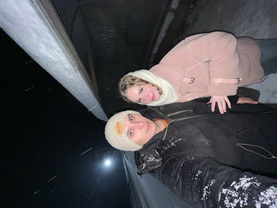 Two individuals, a male and a female, are depicted in an outdoor nighttime setting during snowfall in Vasilyevo, Russia