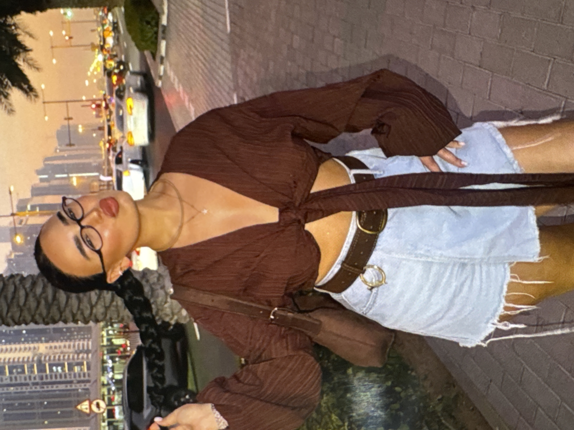 The scene is set in the city of Yerevan, Armenia, at dusk or early night. A female individual stands on a paved sidewalk, centered, facing the camera with a slight head tilt and puckered lips. She wears small, black-framed oval glasses, a dark brown long-sleeved crop top tied at the front, light blue distressed denim shorts with a raw hem, a dark brown belt with a gold-colored buckle, and a small brown shoulder bag over her right shoulder. Her dark hair is pulled back, with a braid extending over her right shoulder. Her right hand is slightly raised, displaying pink fingernail polish and a bracelet. The background features a multi-lane road with moving vehicles, their headlights and taillights illuminated. Tall, modern skyscrapers and palm trees line the street, under an orange-pink sky, with streetlights and traffic signs also visible.