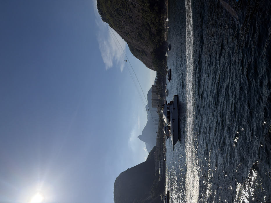 A harbor scene shows a large boat floating on water. Mountains stand near the shore, with a cable car running to the top of one. The iconic shape of Sugarloaf Mountain is visible in the background. The sky is mostly clear with a few wispy clouds. The sun shines brightly on the left, causing a glare.