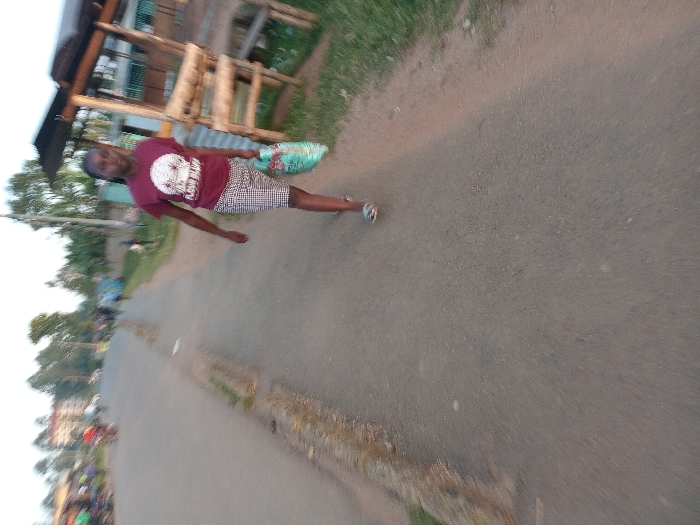An outdoor, eye-level photograph captures a street scene in the city of Kakamega, Kenya, during late afternoon daylight