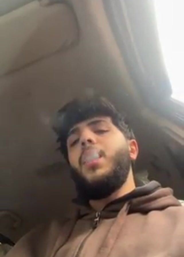 A young man with dark hair and a beard is sitting in a car, wearing a brown hoodie. He is holding a cigarette in his hand and exhaling smoke. The car has a sunroof, and the sun is shining brightly outside.