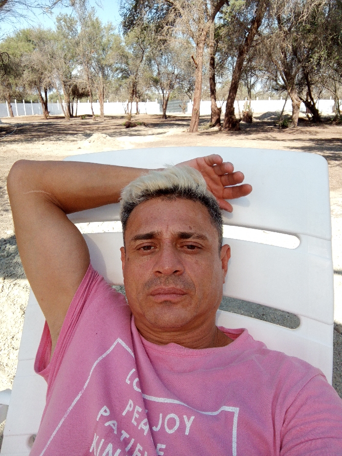 A man with short, bleached-blond hair reclines on a white plastic chair, his right arm raised behind his head. He wears a pink t-shirt with white lettering. The background features a sunlit, sandy area with sparse trees and a white fence in the distance. The overall scene conveys a sense of relaxation and leisure.