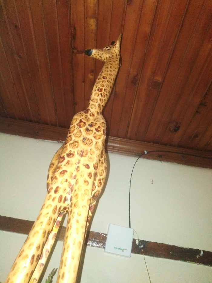 A wooden giraffe figurine stands tall against a backdrop of dark wooden ceiling panels