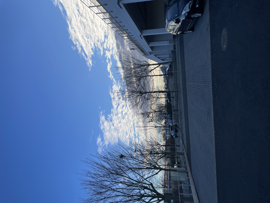 The image depicts an outdoor urban environment in Plaisir, France, under a clear blue sky with significant altocumulus cloud formations, particularly dense on the right side. The foreground consists of a dark asphalt surface transitioning to a grey interlocking paver area, with a circular metal manhole cover visible on the right. Along the left and central midground, multiple bare deciduous trees are present, their branches silhouetted against the sky. A large, dark bird's nest is visible within the upper branches of a tree located in the mid-left portion of the frame. To the far left, a low, light-colored barrier, possibly glass-paneled, runs horizontally. Dominating the right side of the image is a large, elevated concrete structure, appearing to be a bridge or overpass, supported by visible pillars. A metal safety railing extends along the upper edge of this structure. Vehicles are present in the scene: a dark-colored minivan is parked or stationary on the paved area in the right foreground. In the background, beyond the trees and beneath the elevated structure, additional vehicles are visible in what appears to be a parking lot or street, including a dark or red SUV/hatchback. No individuals are visible, and no specific actions or interactions are depicted.