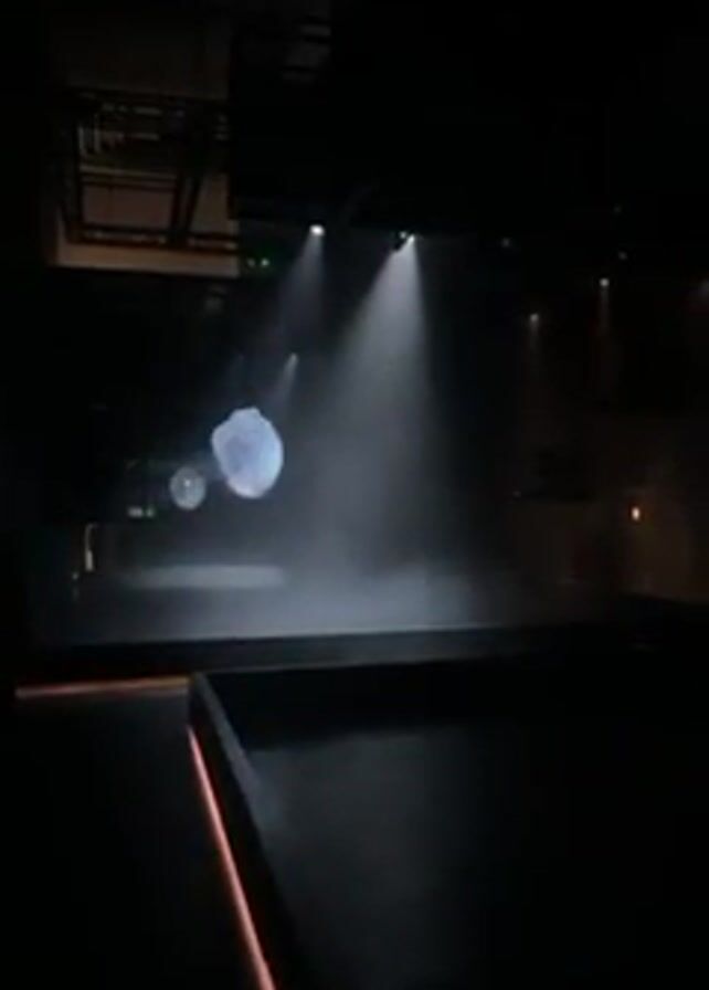 dark, industrial-looking space, possibly a stage or performance area. Three spotlights illuminate a stage with a slight fog effect. Two amorphous, luminous shapes are projected onto the back wall, resembling abstract clouds or floating objects. A person walks from right to left in front of the stage, toward the light. The overall environment is dim, with a modern or minimalist aesthetic. Structural beams and lighting equipment are visible overhead, adding to the industrial feel. A dark rectangular structure, possibly a pool or stage feature, is visible in the foreground, with a thin strip of light running along its edge.